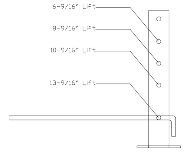 First used in the 2015 International King Kong Grip contest as a way to standardize events and simplify judging. This cross guard when pinned into 1 of 4 locations allows for a 6", 8", 10" and 13" lift to a 16.5" Height standard used in grip sport.